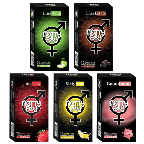 - NottyBoy Condoms Variety Pack: Bubble Gum, Green Apple ,Banana, Strawberry, Choco Flavored Plain Condoms, Best used for oral encounters with your partner.